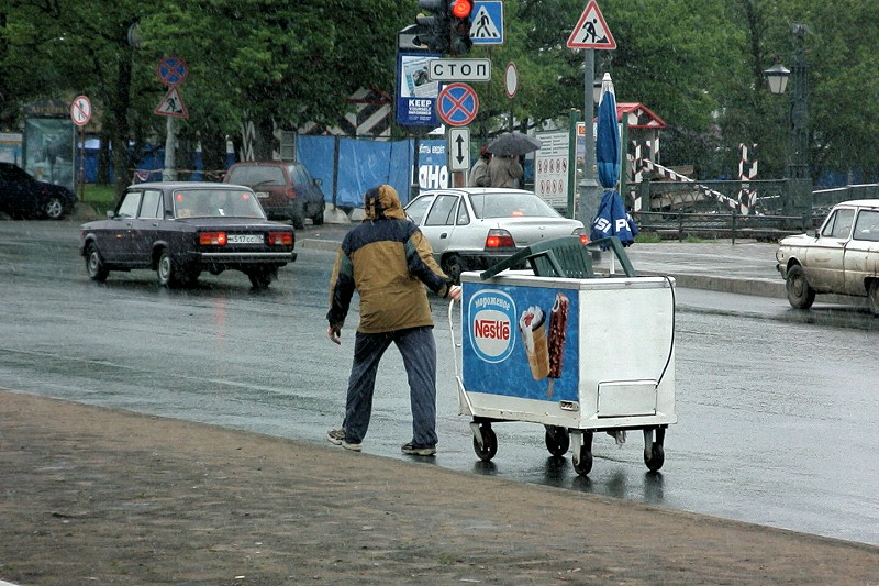 Eisverkäufer bei Schneeregen |